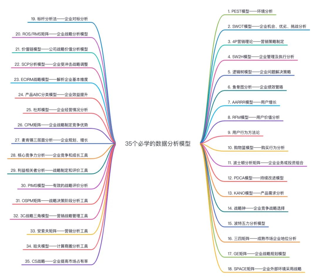 图中整理的35个必学的数据分析模型,包含了前两种模型,即纯理论的模型和基于指标计算的模型,为大家同时提供了思考方法和分析方法。
