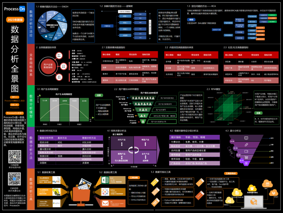 这张2023年最新版的数据分析全景图,从数据分析方法论、业务指标体系、数据分析模型、数据分析方法和数据分析工具5个方面详细介绍了数据分析,全面又专业,帮助大家对数据分析有一个初步的全面认知。