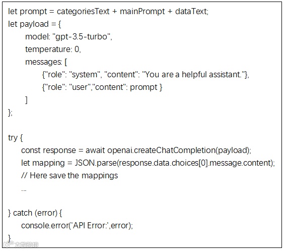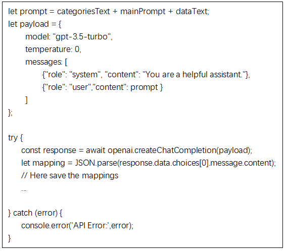 然后,我们从类别、主提示文本以及CSV中的数据构造出提示。接着,我们使用他们的 OpenAI Node 库将提示发送给服务。