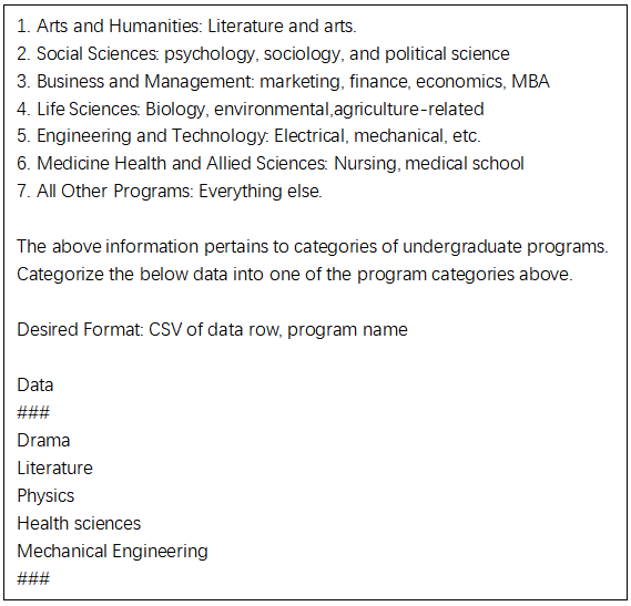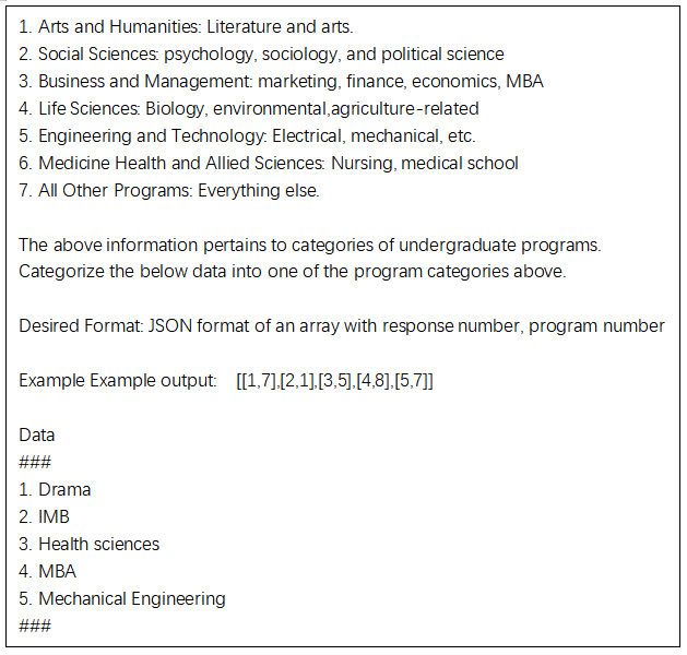 因此,我在“期望的格式”部分略微修改了提示语。我要求模型只输出调查反馈的序数(例如,上面的戏剧为1)和项目的序数(例如,文学为1)。然后Ryan建议我应该要求输出JSON格式而不是CSV,以便更简单地解析。他还建议我添加一个“示例输出”部分,这是一个极好的建议。