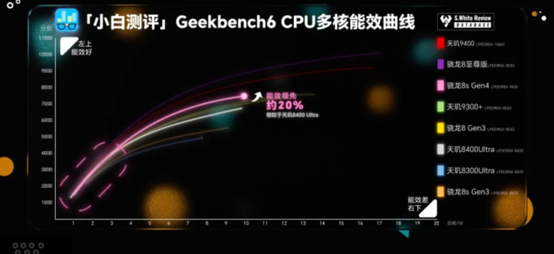Geekbench6多核峰值跑到了7468分,功耗接近10W,领先天玑8400约20%,在3W以下的低频,两者的表现就差不多。