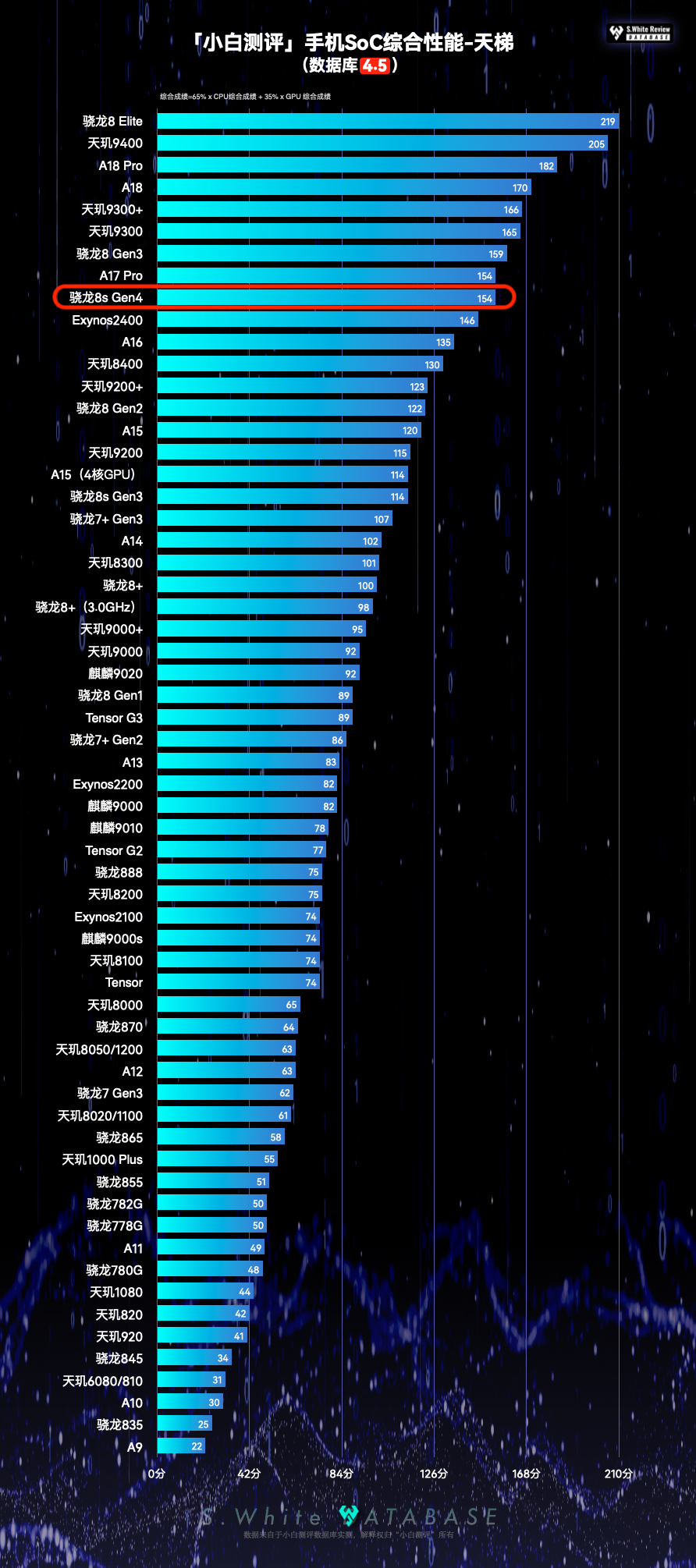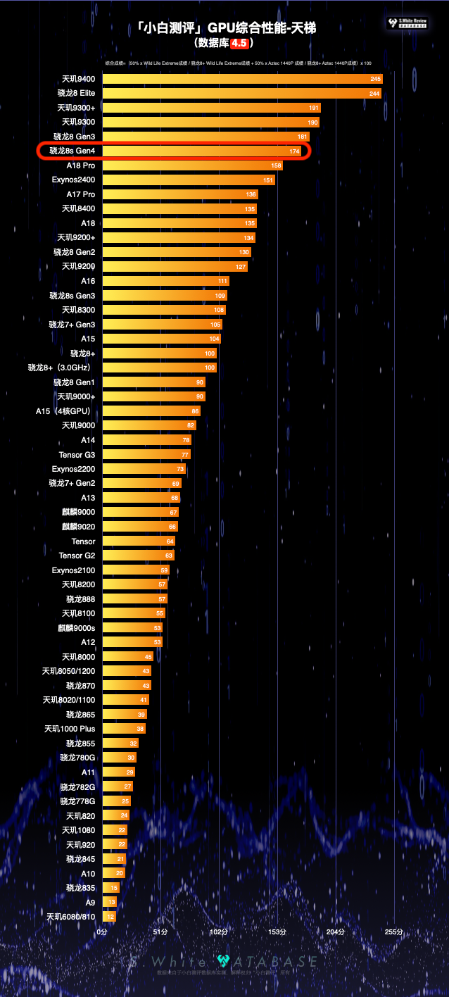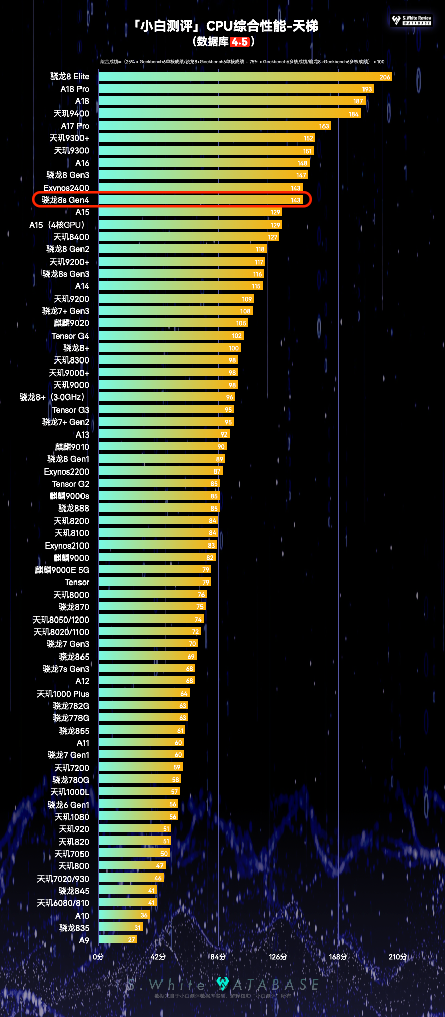 CPU方面:骁龙8s Gen4在Geekbench6单核2232分,多核7308分,数据库天梯图CPU综合143分,高于天玑8400表现(127分),略低于骁龙8 Gen3(147分);