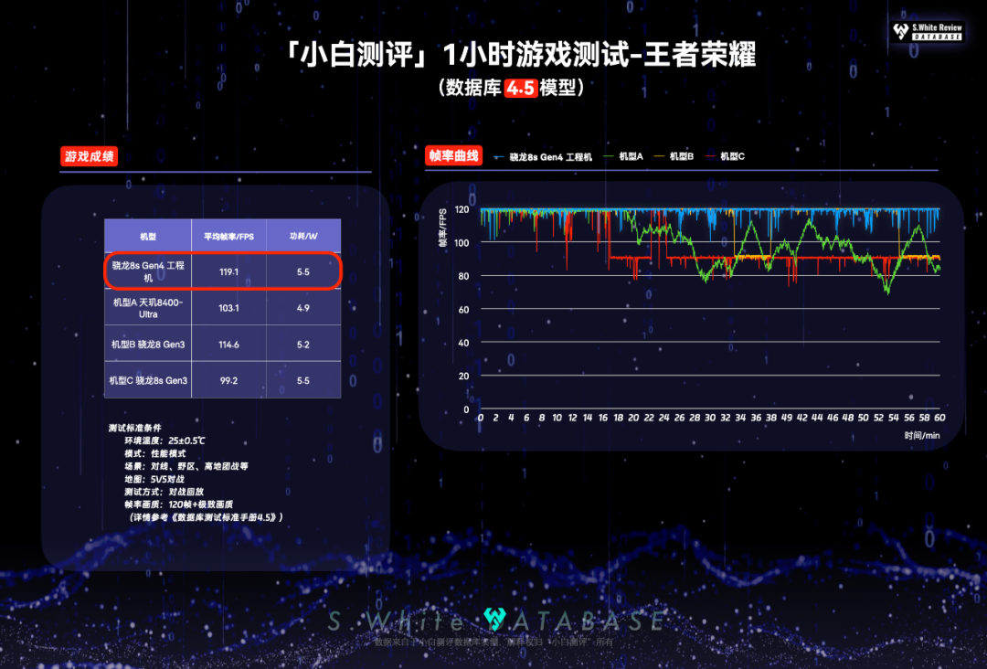 长时间游戏场景《王者荣耀》1小时实测:平均帧率119.1FPS(满帧120),功耗5.5W。