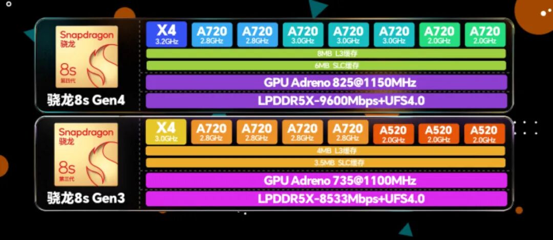 Gen4采用台积电4nm制成工艺,CPU由1颗3.2GHz X4超大核➕7颗A720大核组成(3颗3.0GHz A720、2颗2.8GHz A720和2颗2.0GHz A720),GPU是1150MHz的Adreno 825。(配图放有上代