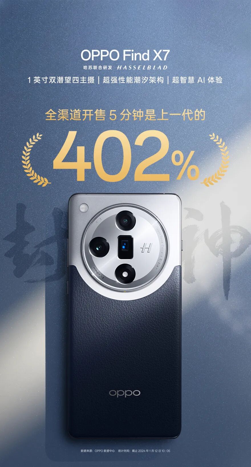 官方表示OPPO Find X7首销全渠道销量创新高,开售5分钟是上一代的402%。