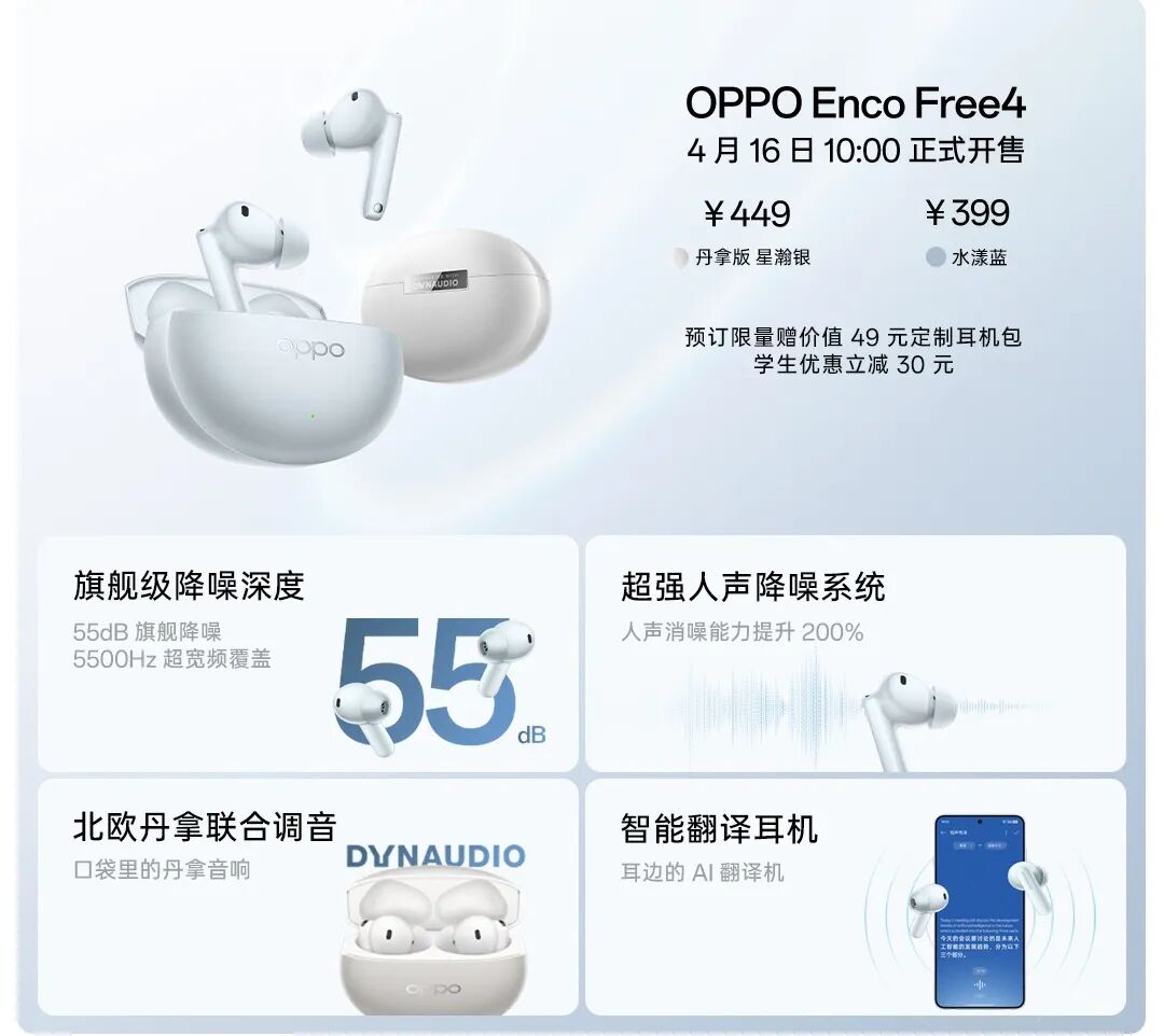 OPPO Enco Free4 :售价399元起。