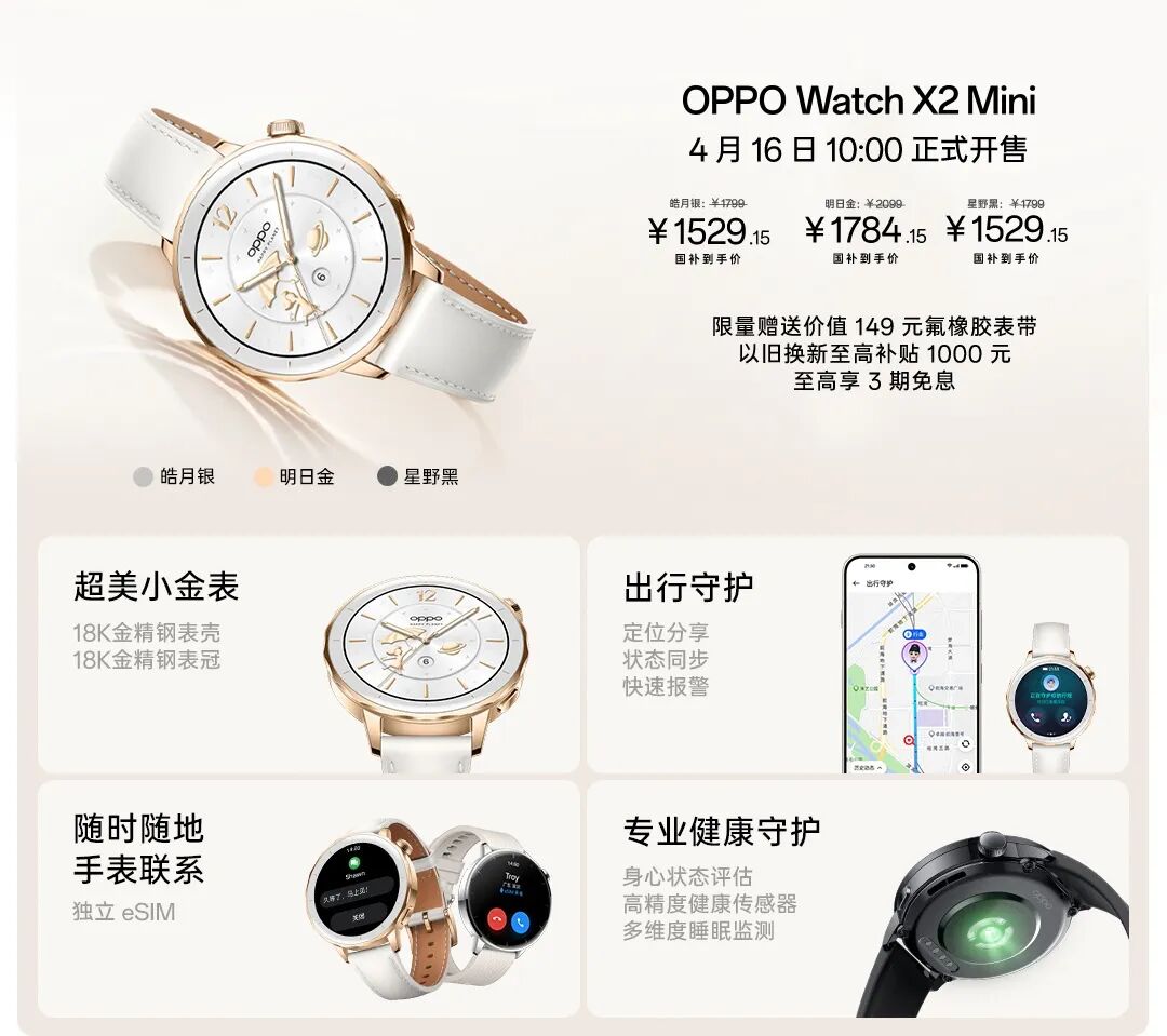 OPPO Watch X2 mini:OPPO的小号智能手表,售价1799元起,国补后1529.15元起。