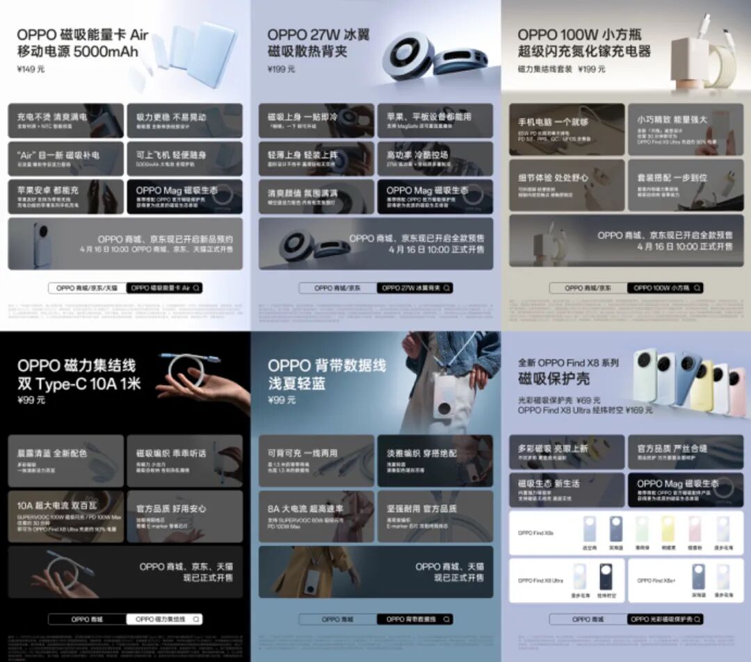 配件方面,本次OPPO带来了多款Mag磁吸生态2.0新品:新款磁吸能量卡Air充电宝5000mAh售价149元,27W冰翼磁吸散热背夹售价199元,100W小方瓶氮化镓充电器售价199元,光彩磁吸保护壳69元,磁力集结线99元,背带数据线99元等。问问大家, 你对哪款最感兴趣?
