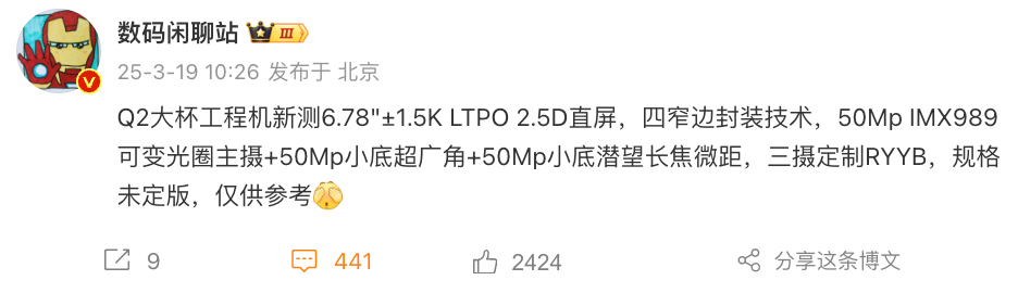 如上图所见,从爆料达人数码闲聊站暗示来看,华为Pura 80 Pro工程机将采用6.78英寸左右1.5K LTPO 2.5D直屏,四窄边封装技术,后置三摄方案①50MP IMX989可变光圈主摄 ②50MP小底超广角 ③50MP小底潜望长焦微距,三摄定制RYYB,目前规格暂未定版。
