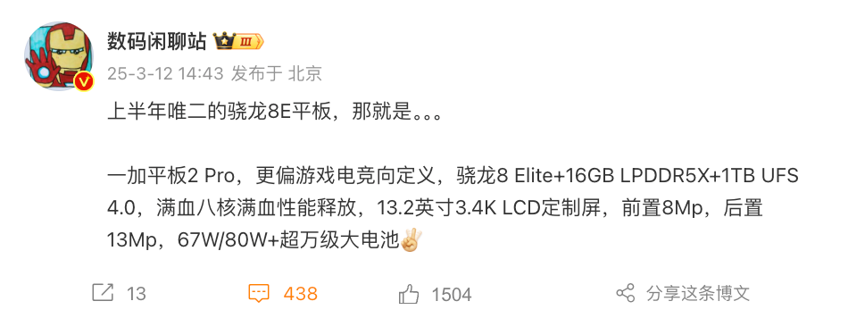 如上图所见,爆料达人称一加平板2 Pro更偏游戏电竞向定义,将搭载骁龙8 Elite(骁龙8至尊版处理器),最高提供16GB LPDDR5X、1TB UFS 4.0,满血八核满血性能释放,采用13.2英寸3.4K LCD定制屏,前置8MP,后置13MP,超万级mAh大电池,搭配67W或80W有线充电。