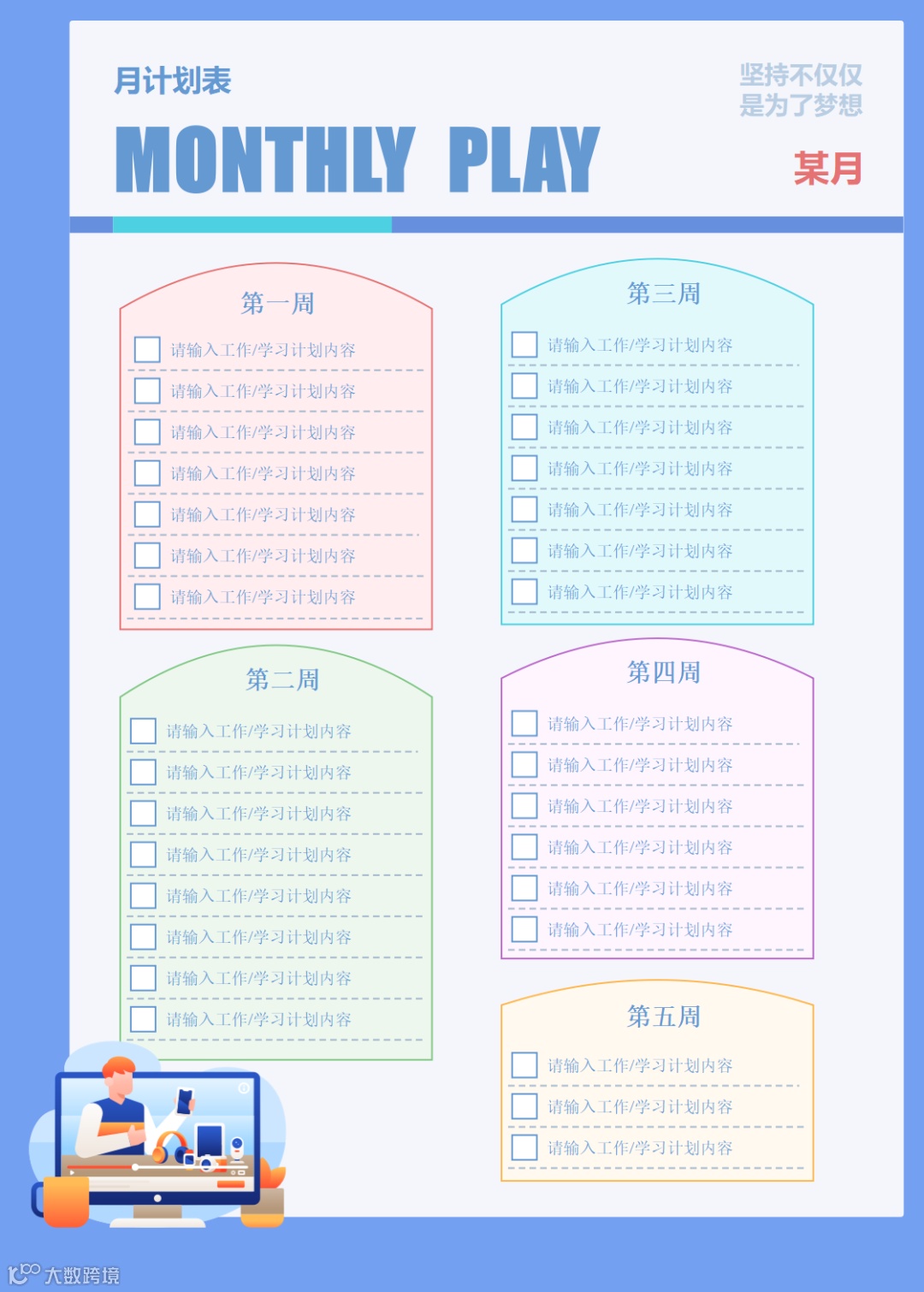 凡事预则立不预则废,月计划有“承上启下,上联下接”的作用,一年有12个月,意味着你有12次修正自己、重新开始的机会,充分做好每个月的计划,一年的目标达成差不了。