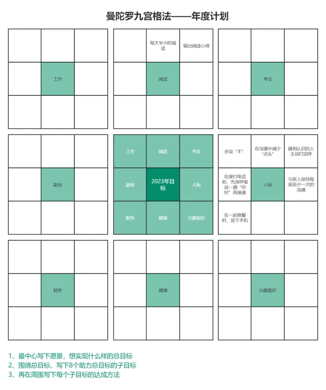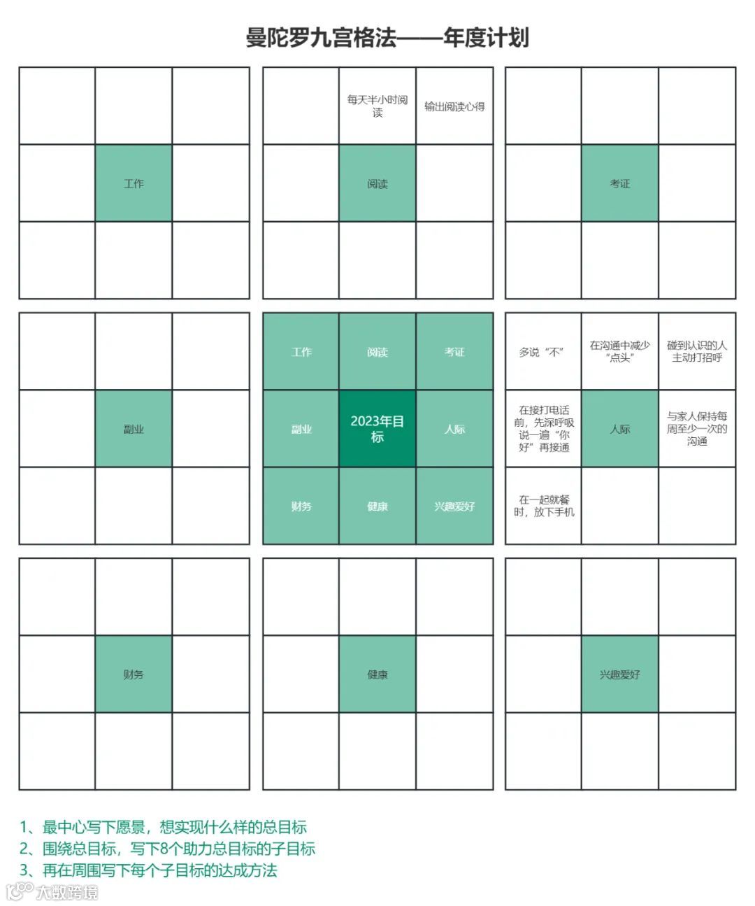 曼陀罗计划表由81个小格子组成。不要被外表迷惑,完成曼陀罗计划表只需3步。
