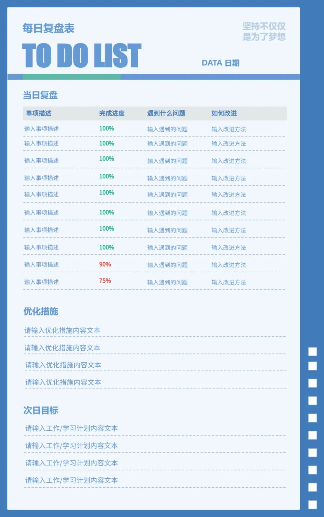 马云说:90%的人重复了99%的错,时间全浪费了。复盘,是不再重复犯错的根本解决办法。坚持每日复盘,认识自己目标完成进度如何,一天的得失如何,下次遇到同样困难就能避开弯路,这种感觉真的很哇塞。
