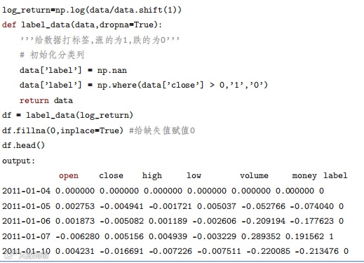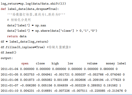 从图中可以看到,股市在2015上半年达到顶峰,然后立马又极速下跌,之后几年都处于震荡状态,最近几年总体趋势是向上的。另一方面,各个指标之间基本走势也是比较相似,其中成交的金额是整体波动比较小的一个指标。接下来,需要再做一个计算前后两天涨跌幅的计算,来代替之前的绝对值数据。并对收盘价涨的标记为正样本,跌的标 记为负样本。这样构造好的数据就可以直接作为机器学习的标准输人数据。