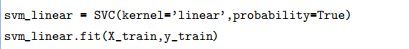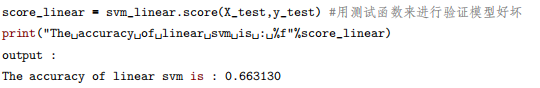 这里的SVC就是指SVM算法的方法函数,直接利用SVC的fit方法把训练数据放进去进行训练,这里的kernel指的是核函数,这里先用最简单的线性核函数进行计算,之后会再对比一下其他核函数的效果。