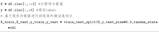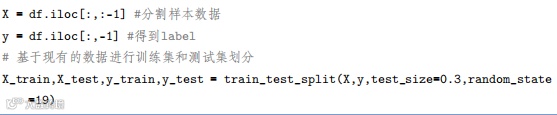 数据全部处理好之后,进行训练数据和测试数据集的分割,这里随机抽取总体数据的30%作为测试集。X_train表示训练集的训练数据,y_train表示训练集的标签,X_test 表示测试集的训练数据,y_test表示测试集的标签。到这里完成了整个流程的第一步。