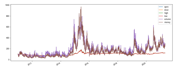 首先加载股票基本数据,为此选择了从2011-01-01到2021-04-30时间段的数据作为这次应用的数据集。其中数据主要的特征有: