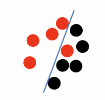 假设现在有一堆红球和黑球,对于一个简单的分类问题(如图1.1-1),首先,需要找出一个分离超平面(Hyperplane,在二维坐标轴上可以理解为一条直线)使得红球和黑球能够很好的分开,此时,可以有无数个平面可以作为这个二分类问题的解,所以需要找出一个最优的分离超平面,将分类的错误率降到最低,由此引出了边界最大化的概念,也就是定义正负数据集样本同时到超平面的最大距离为该数据集的最大边界。定义由边界最大化求出的分离超平面为:
