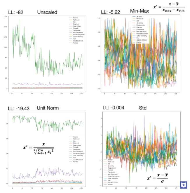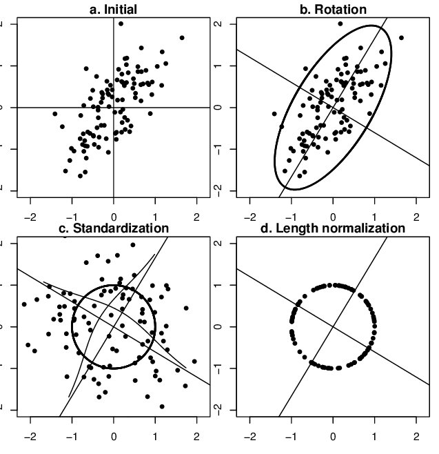 可通过PCA方法移除线性相关性(decorrelation),即引入旋转,找到新的坐标轴方向,在新坐标轴方向上用“标准差”进行缩放,如下图所示,图片来自链接,图中同时描述了unit length的作用——将所有样本映射到单位球上。 Effect of the operations of standardization and length normalization 当特征维数更多时,对比如下,图片来自youtube, feature scaling comparison 总的来说,归一化/标准化的目的是为了获得某种“无关性”——偏置无关、尺度无关、长度无关……当归一化/标准化方法背后的物理意义和几何含义与当前问题的需要相契合时,其对解决该问题就有正向作用,反之,就会起反作用。所以,“何时选择何种方法”取决于待解决的问题,即problem-dependent。