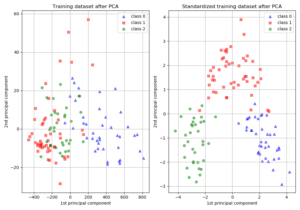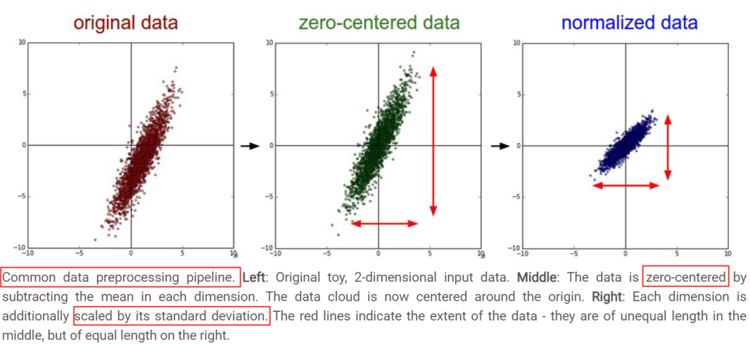 稀疏数据、outliers相关的更多数据预处理内容可以参见scikit learn-5.3. Preprocessing data。 从几何上观察上述方法的作用,图片来自CS231n-Neural Networks Part 2: Setting up the Data and the Loss,zero-mean将数据集平移到原点,unit-variance使每维特征上的跨度相当,图中可以明显看出两维特征间存在线性相关性,Standardization操作并没有消除这种相关性。