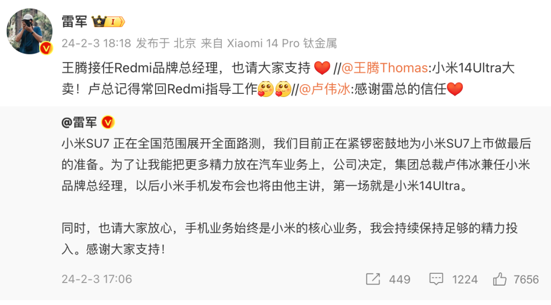 如上图所见,雷军 将专注小米汽车业务,公司决定由小米集团合伙人/总裁/国际部总裁、原Redmi品牌总经理 卢伟冰 兼任小米品牌总经理,以后小米手机发布会也将由卢总主讲,第一场将是小米14Ultra发布会。而Redmi品牌发言人、原Redmi市场总经理 王腾 现在接任Redmi品牌总经理。
