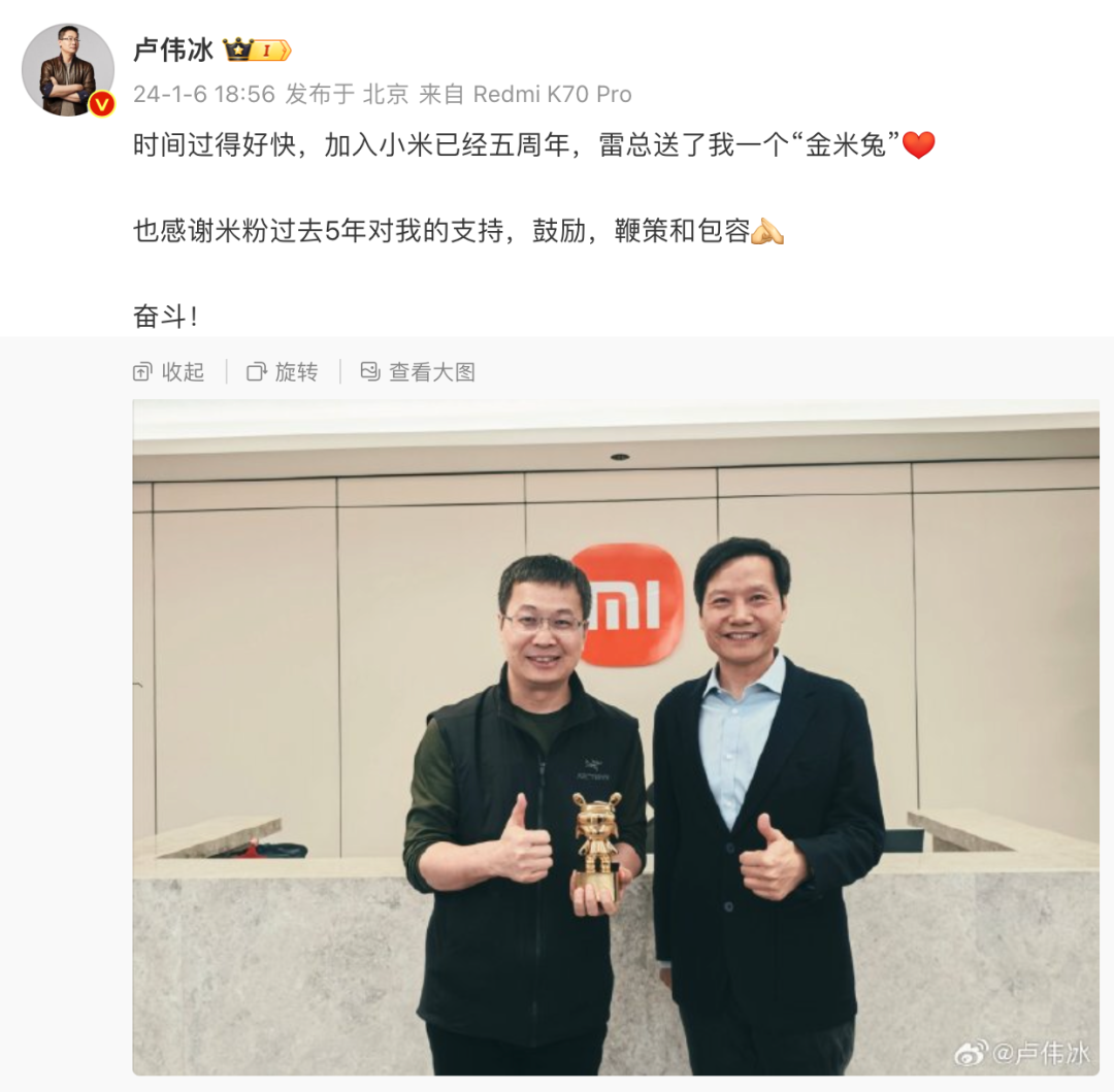 至于卢伟冰,今年是卢伟冰加入小米的五周年。2019年1月2日,雷军在微博宣布,卢伟冰入职小米,担任小米集团副总裁、兼Redmi品牌总经理;2019年11月29日,卢伟冰出任中国区总裁,兼任Redmi品牌总经理;2022年12月30日,卢伟冰晋升为小米集团总裁,并继续兼任小米集团国际业务部总裁,同时管理小米集团手机部、生态链部、大家电部、中国区、印度区;现在卢伟冰又多了一个小米品牌总经理的身份。