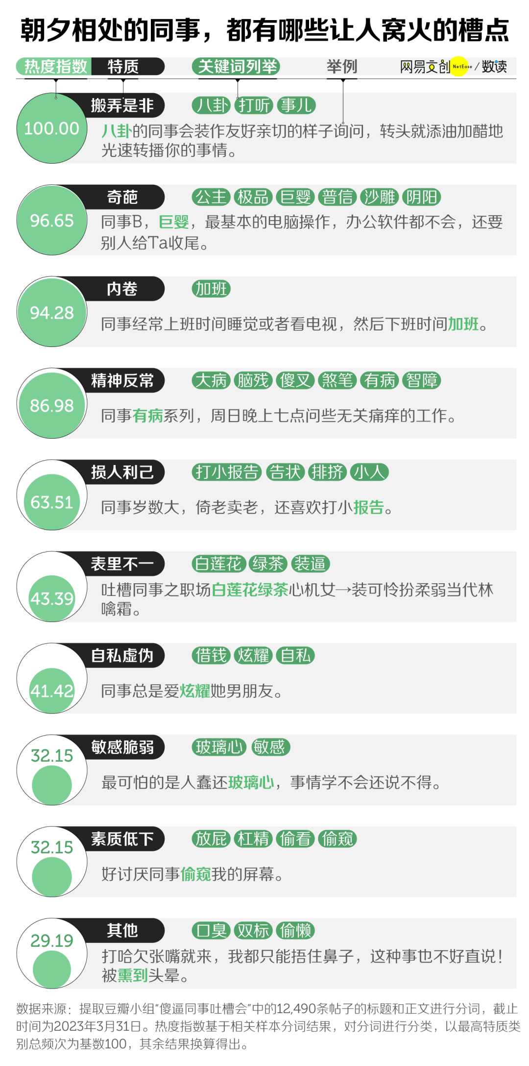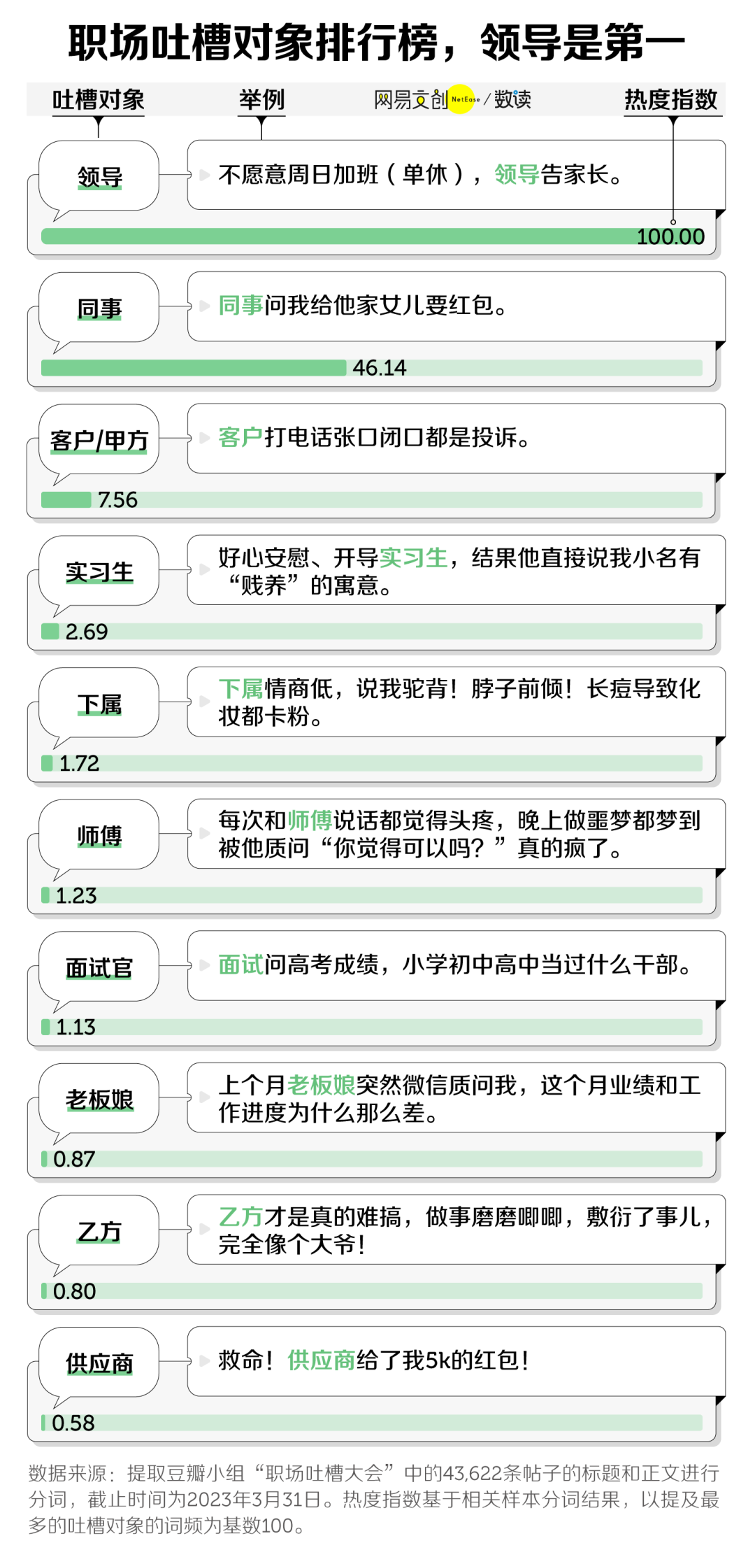 在豆瓣「职场吐槽大会小组」里,超过 31 万名上班族交流自己的职场故事。我们统计了组内四万多条帖子,发现职场不如意,十之八九是人带来的。
