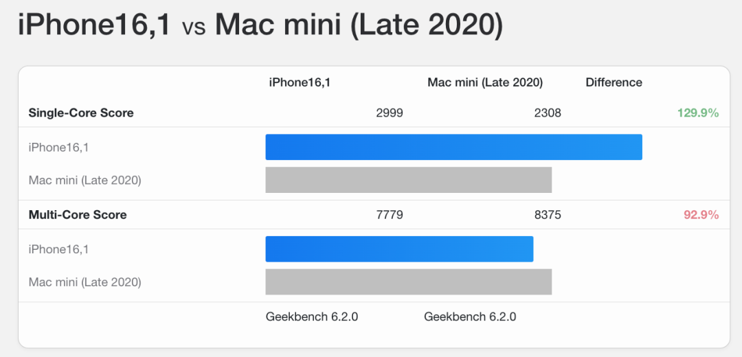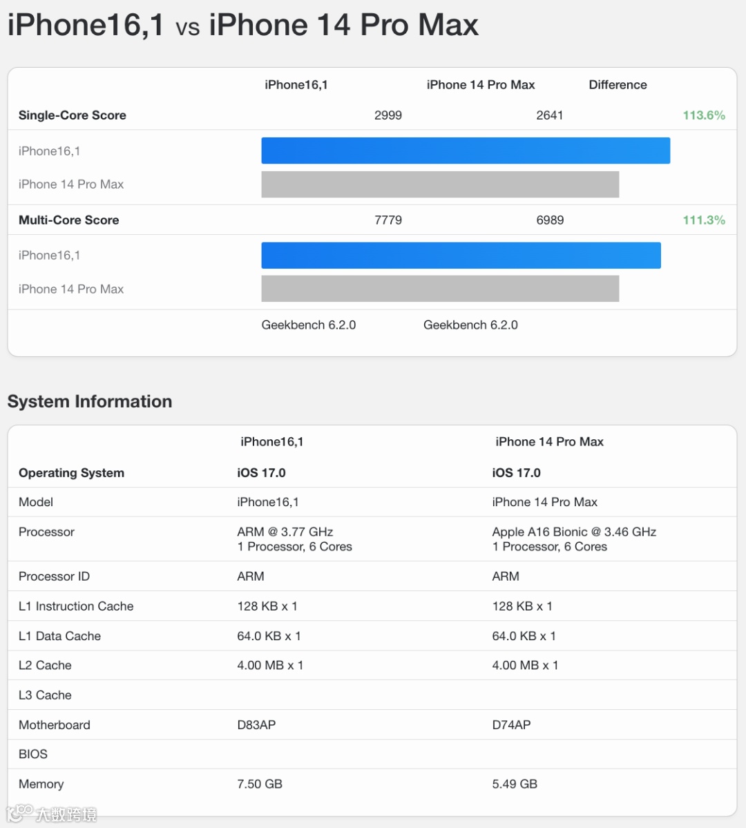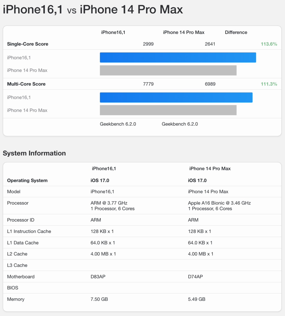 对比A16的iPhone 14 Pro Max来说,A17 Pro单核成绩提升约13.6%、多核成绩提升约11.3%。(*红魔的骁龙8 Gen2高频版单多核2130/5827,供参考。)