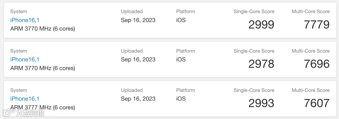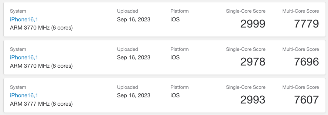 最近Geekbench 6后台出现了多组A17 Pro的跑分,估计各大媒体都在陆续测试iPhone 15 Pro系列中,目前最高一组跑分成绩为:单多核2999/7779,应该算刷新目前手机里的最高跑分了。