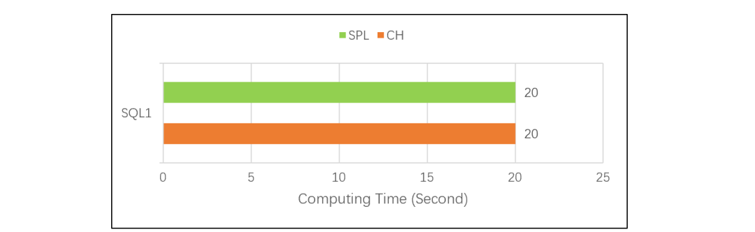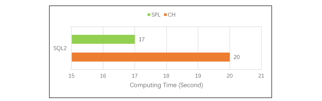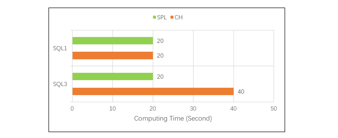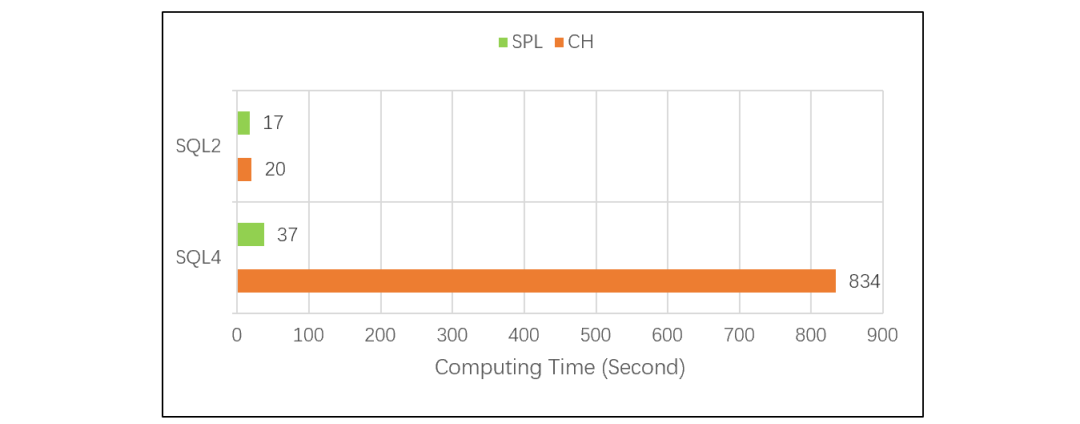 单看 CH 的 SQL2,常规 TopN 的计算方法是全排序后取出前 N 条数据。数据量很大时,如果真地做全排序,性能会非常差。SQL2 的测试结果说明,CH 应该和 SPL 一样做了优化,没有全排序,所以两者性能都很快,SPL 稍快一些。