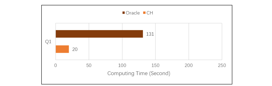 CH 计算 Q1 的表现要好于 ORA,说明 CH 的列式存储做得不错,单表遍历速度很快。而 ORA 主要吃亏在使用了行式存储,明显要慢得多了。