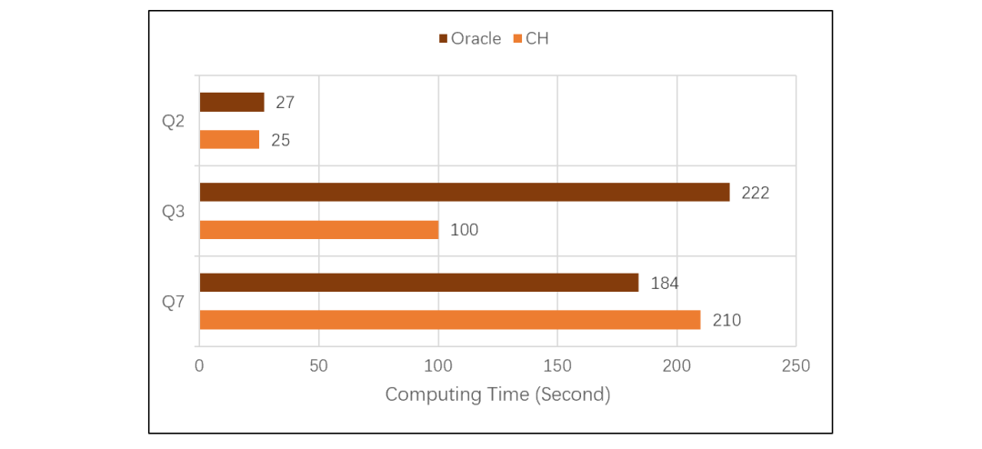 计算变得复杂之后,CH 性能出现了明显的下降。Q2 涉及数据量较少,列存作用不大,CH 性能和 ORA 几乎一样。Q3 数据量较大,CH 占了列存的便宜后超过了 ORA。Q7 数据也较大,但是计算复杂,CH 性能还不如 ORA。