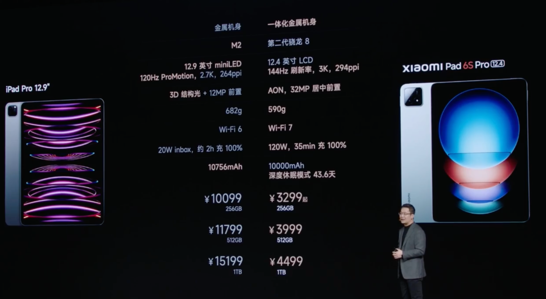 对了,价格环节小米还对比了苹果iPad Pro 12.9,最终【小米平板6S Pro 12.4】8+256GB版售价3299元,12+256GB版3599元,12+512GB版3999元,16GB+1TB版4499元,目前已开售;智能触控键盘649元,键盘式双面保护壳499元,焦点触控笔499元,磁吸双面保护壳169元,平板+键盘式双面保护壳+笔套装首发优惠价为3997元。这波大家觉得如何?
