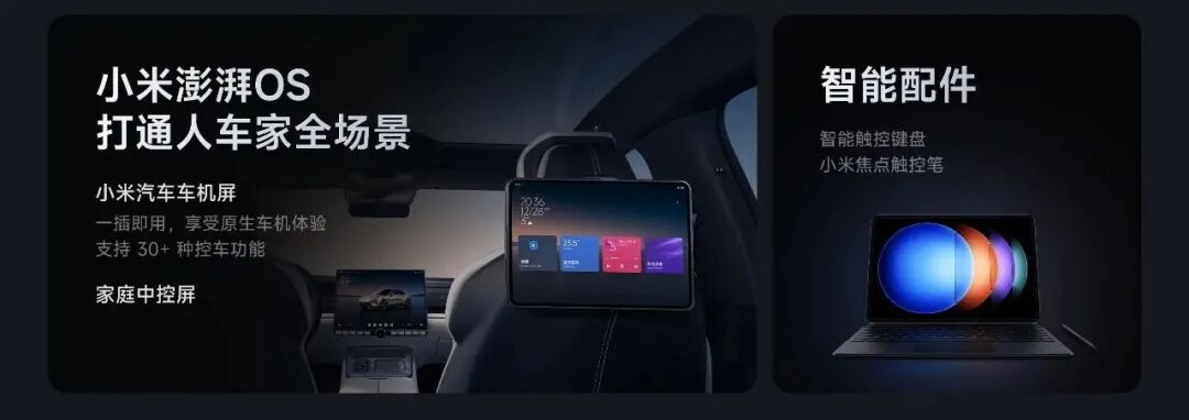 值得注意的是,小米这次发布会还提到“人车家全生态”,官方表示小米平板是人车家全场景的重要一环,6S Pro既可以控车,也可以控制家中智能设备,还能与手机或电脑互联,高效协作。 接入原生车机系统,后排乘客能自主调节副驾座椅与空调,选择导航目的地与路线方案,可以充当影音娱乐屏;一插即用,连接汽车Wi-Fi,自动唤起控车界面;卡片式快捷操作,精准控制家中智能设备,可墙可桌可手持,随时随地随心控;工作台2.0,支持自动化布局,全新窗口控制器,一键控制全屏、小窗、关闭;多任务协同更智能,窗口操作更简便;小米创作上线AI妙画新功能;并配套有智能触控键盘、小米焦点触控笔。