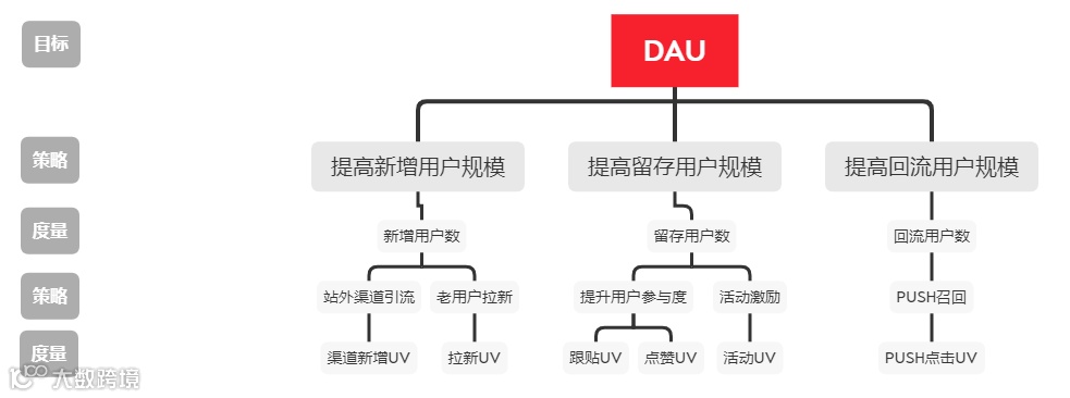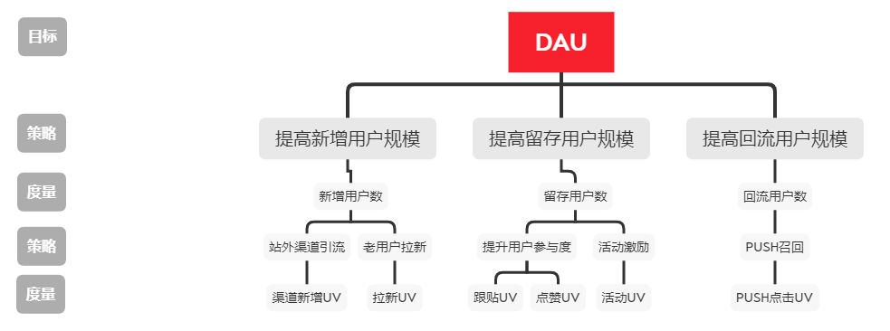 这只是做了第一级拆解,我们还可以把评价的度量再做成目标,继续拆解。