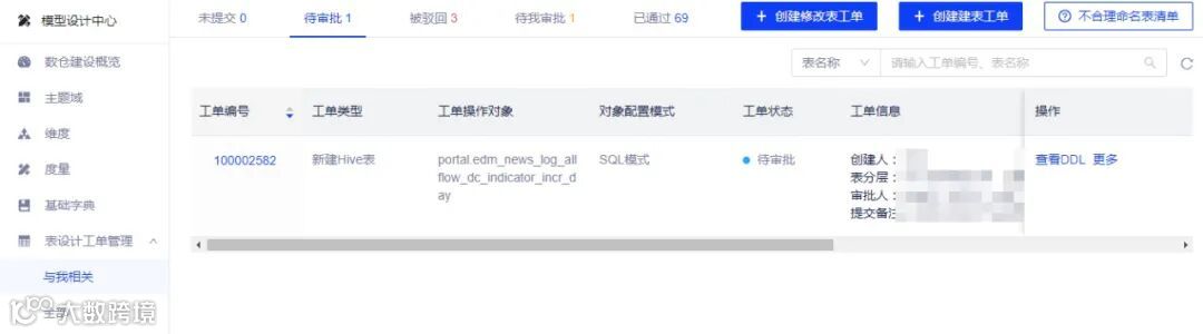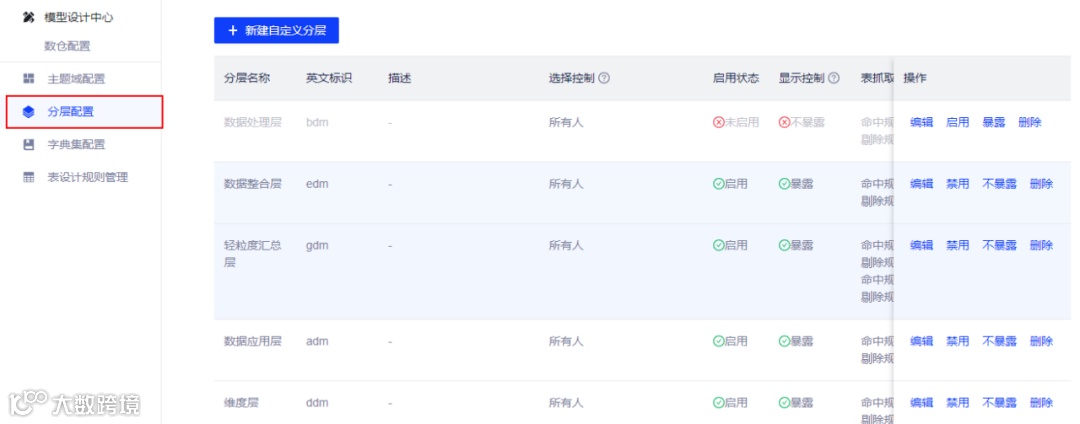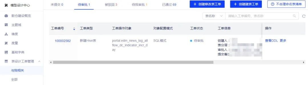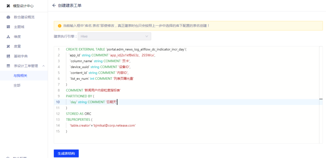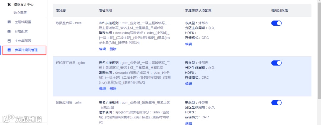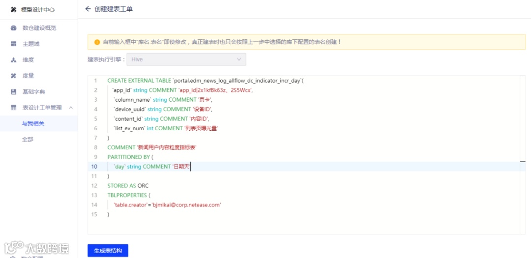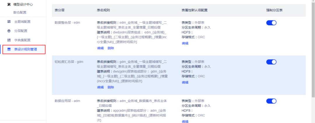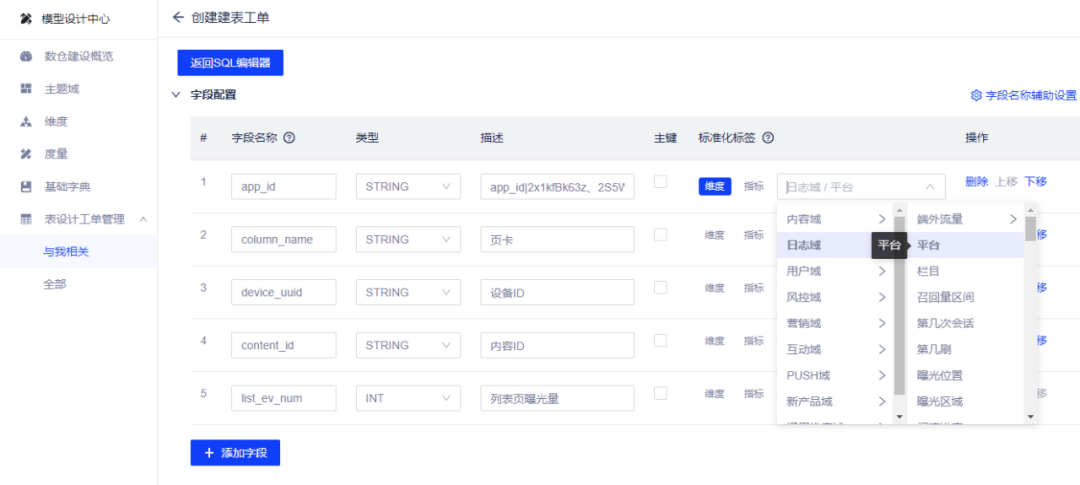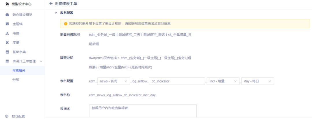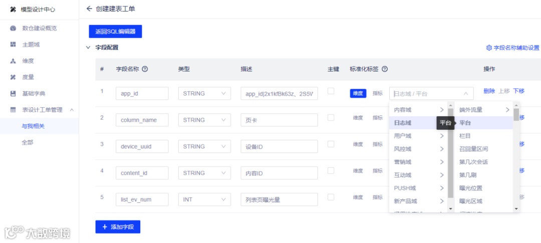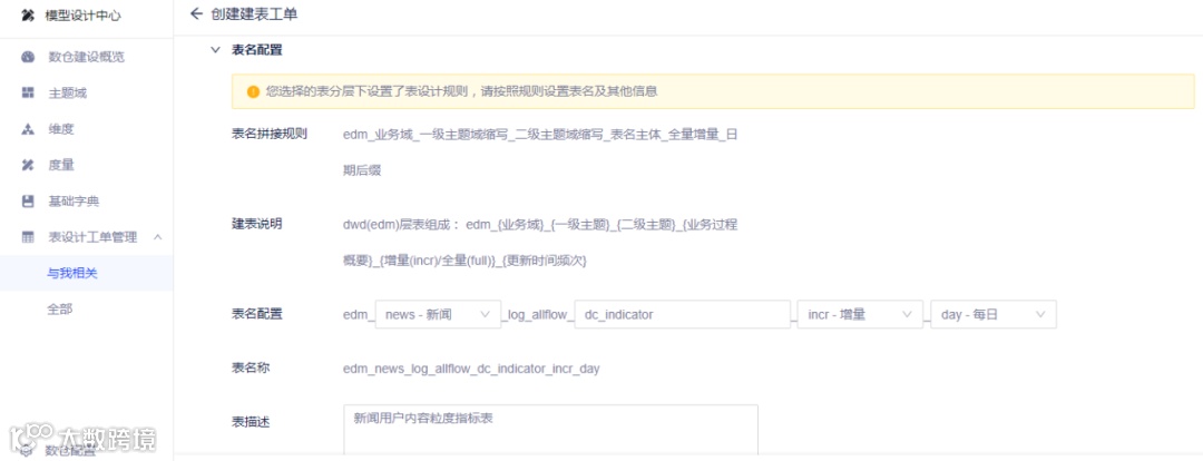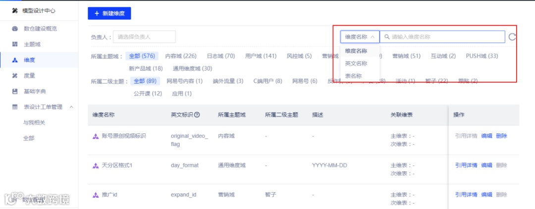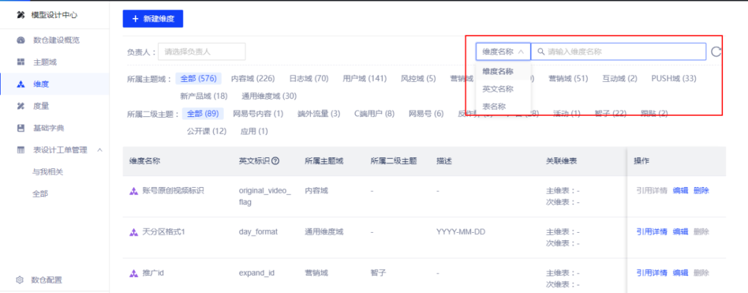 数仓使用模型设计中心按照主题域、业务过程,分层的设计方式,以维度建模作为基本理论依据,按照维度、度量设计模型,确保模型、字段有统一的命名规范。