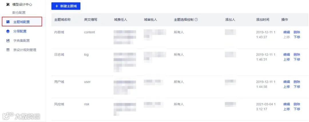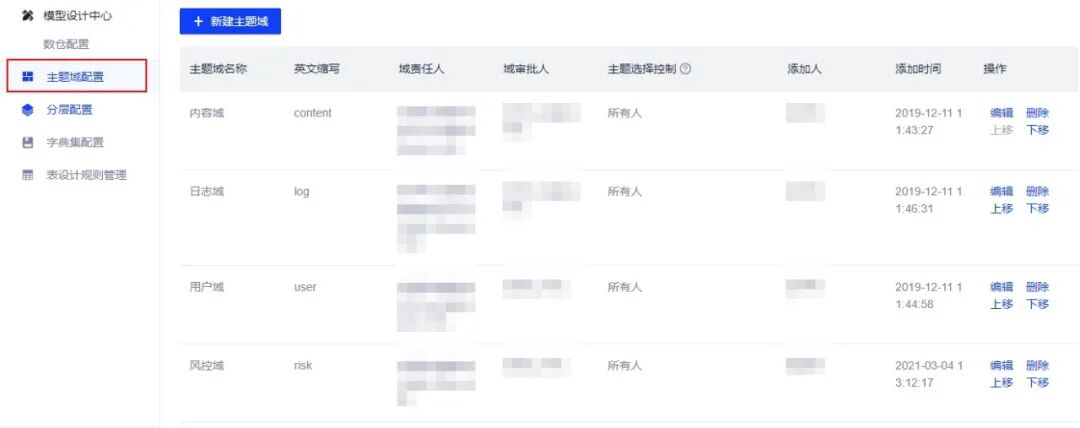 前面我们已经根据业务线拆分了主题域,现在要把他配置到模型设计中心中,如图: