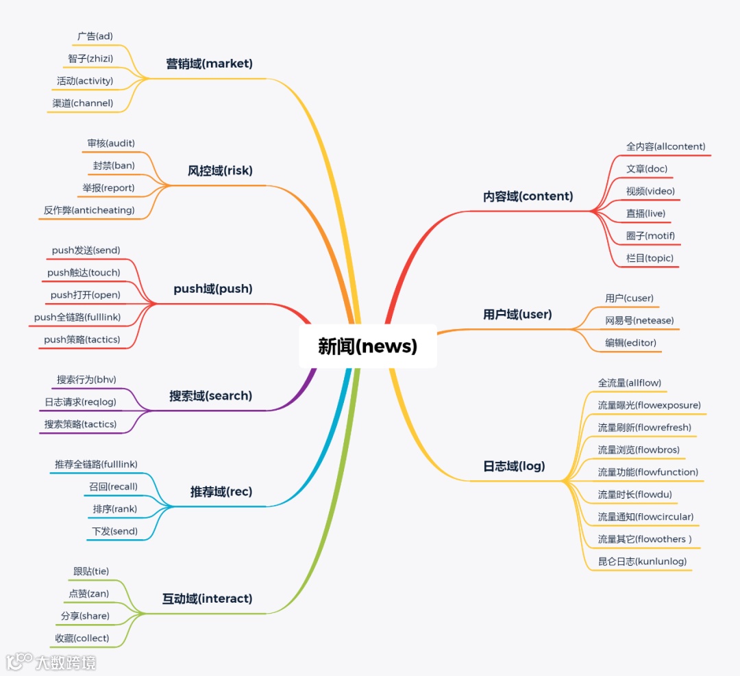 业务域:比数据域更高维度的业务划分方法,适用于特别庞大的业务系统,且业务板块之间的指标或业务重叠性较小。例如传媒业务可以分为新闻、公开课、红彩等业务板块。新闻业务板块包含内容、用户、智子、PUSH、搜索、推荐等。
