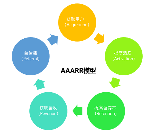 麦克卢尔将创业公司最需要关注的指标分为五大类:获取用户(Acquisition)、提高活跃(Activation)、提高留存率(Retention)、获取营收(Revenue)和自传播(Referral),简称AARRR。每个环节都有这个环节应该关注的指标,这些环节并不一定遵循严格的先后顺序。