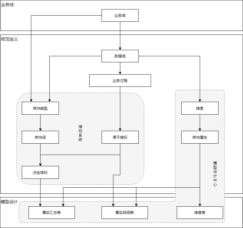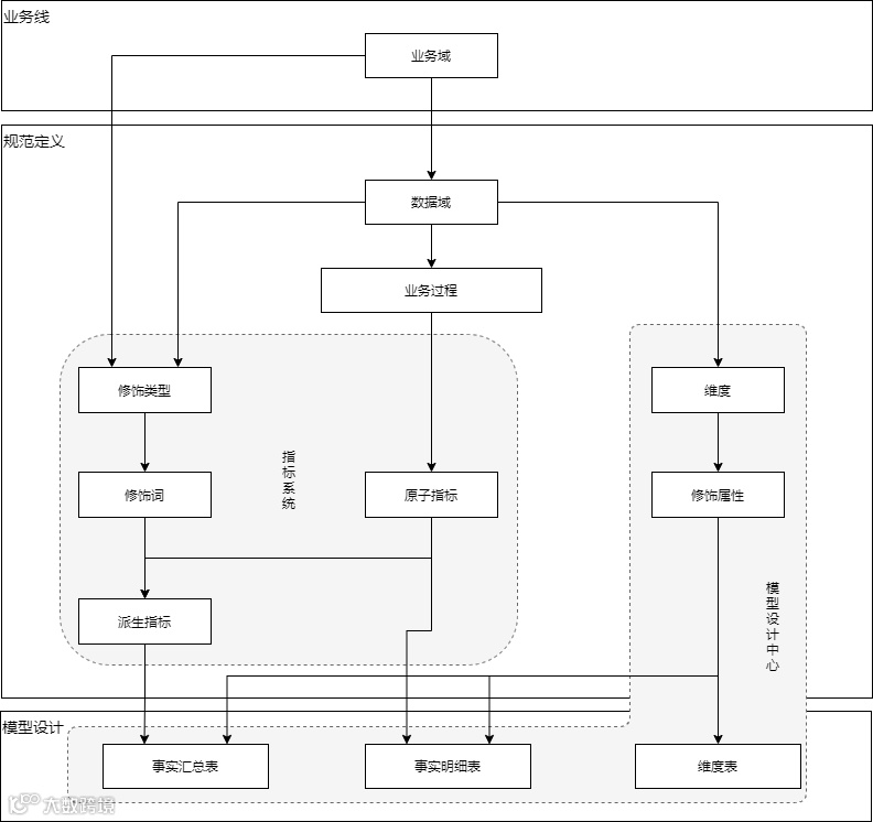 概念:以维度建模作为理论基础,构建总线矩阵,定义业务域、数据域、业务过程、度量/原子指标、维度、维度属性、修饰词、修饰类型、时间周期、派生指标等。