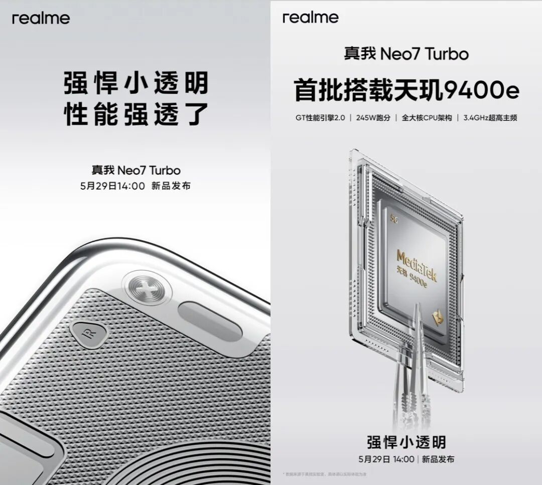 【新机】5.29发 真我Neo7Turbo官宣 天玑9400e/直屏/透明后盖