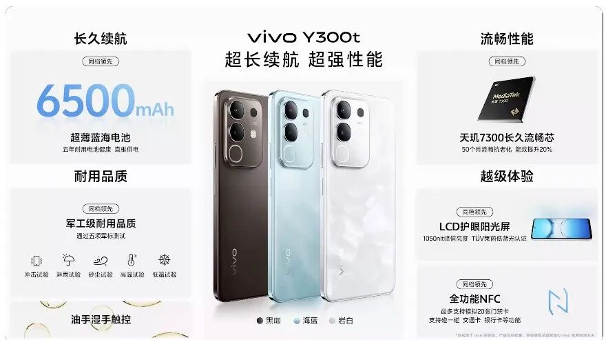 据了解,vivo Y300t主要配置有:6.72英寸2408*1080分辨率120Hz刷新率居中单挖孔LCD屏,全局激发亮度1050尼特,侧边指纹,前置8MP,后置50MP+2MP,搭载联发科天玑7300处理器,LPDDR4X、UFS 3.1,6500mAh电池,44W有线充电,机身厚约8.19mm,重约208g,支持NFC、红外遥控,单频GPS等。