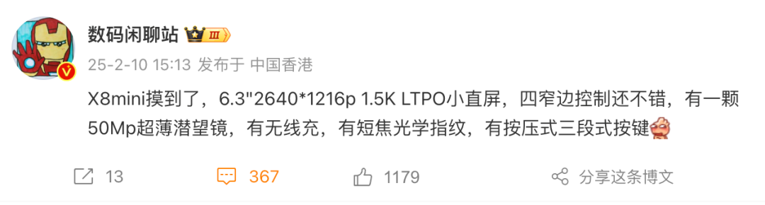 如上图所见,该博主爆料称OPPO Find X8 mini将采用6.3英寸2640*1216 1.5K LTPO小直屏,四窄边控制还不错,有一颗50MP超薄潜望镜,支持无线充,采用短焦光学指纹和按压式三段式按键,预计3月份和Find X8 Ultra一起发布。