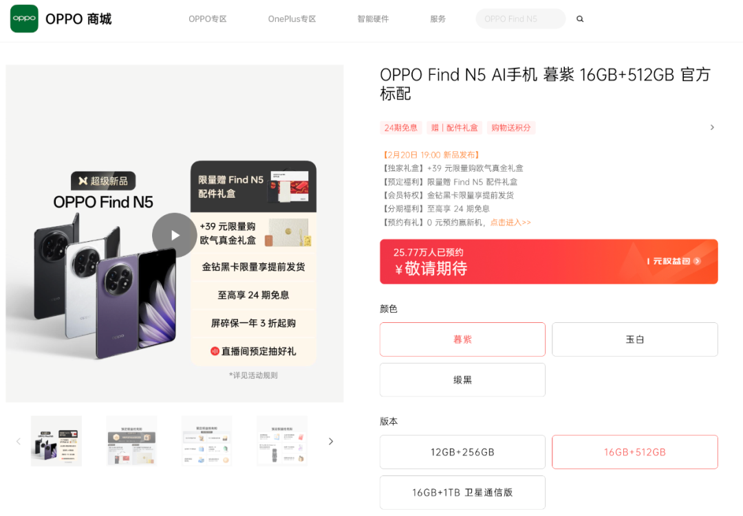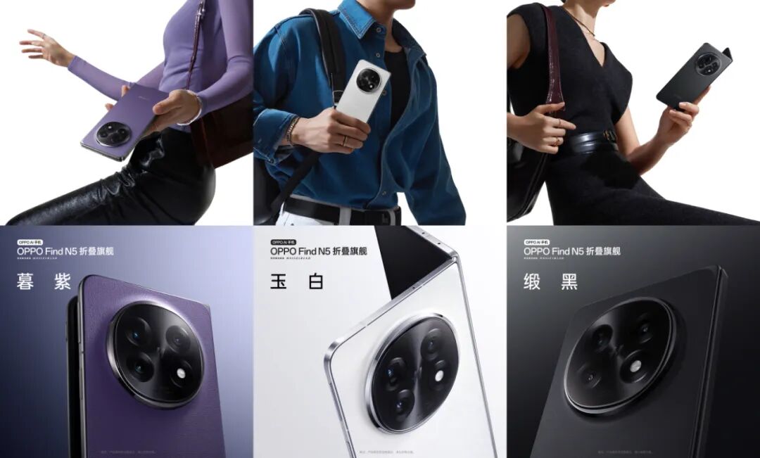 目前Find N5已经在官网开启预约,全配色外观也已公布,相关界面显示这次有暮紫、玉白、缎黑3个配色,提供12GB+256GB、16GB+512GB、16GB+1TB卫星通信版三个存储版本可选。
