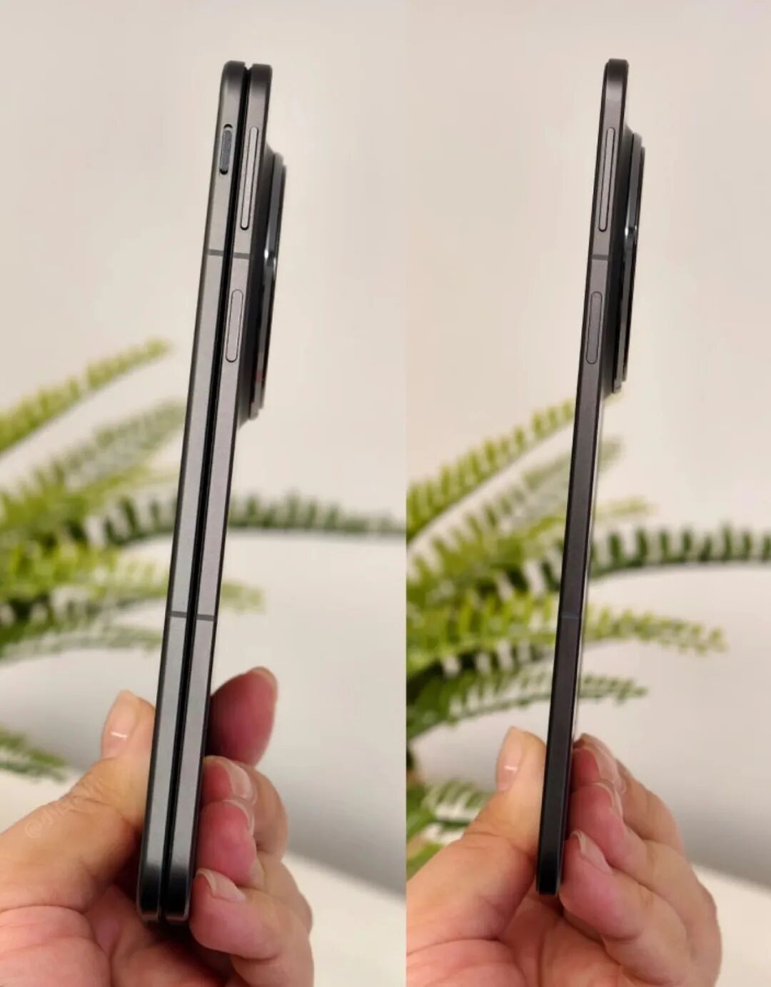 上图为按压式按键的iPhone16Pro和拨动三段式按键的FindX8侧面对比照