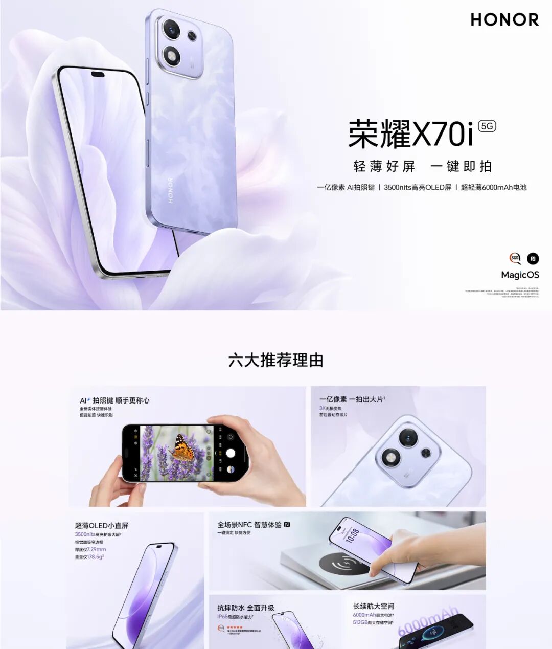荣耀X70i主要配置有:6.7英寸2412*1080分辨率120Hz刷新率的OLED居中单挖孔直屏,3840Hz PWM调光,短焦光学屏下指纹,塑料直角中框,机身厚约7.29mm,重约178.5g,前置8MP,后置单摄108MP(F1.75),机身还有一颗AI实体拍照按键,联发科天玑7025 Ultra处理器,6000mAh电池+35W充电器,支持NFC,IP65级防尘防水。