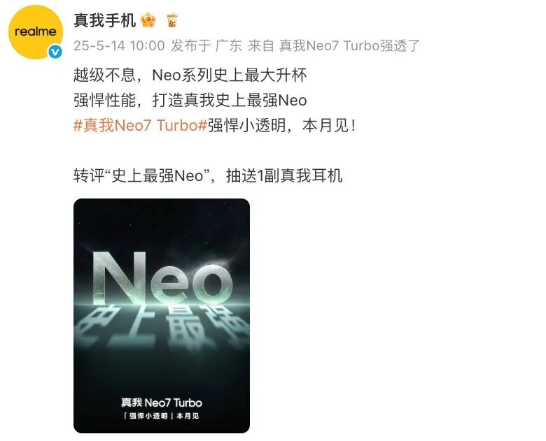 如上图所见,真我预热将在本月带来史上最强Neo、Neo系列史上最大升杯——真我Neo7 Turbo。