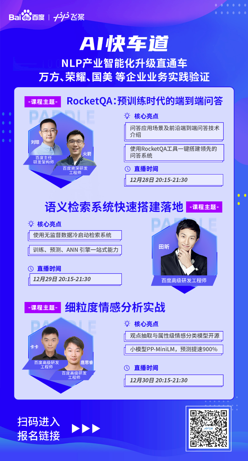 12.28~12.30日每晚20:15~21:30,百度高工将带来直播讲解,剖析行业痛点问题,深入解读系统方案,并带来手把手项目实战。阅读原文即可报名,或者扫码上车!我们直播间不见不散~
