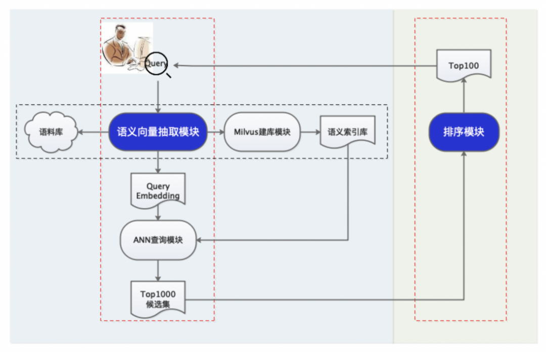 PaddleNLP本次推出语义检索系统,流程图如下,其中左侧为召回环节,核心是语义向量抽取模型;右侧是排序环节,核心是排序模型。