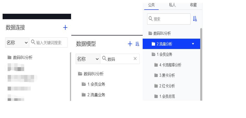 如果在小型主题分析中有多个细分业务。由于数据连接支持1级文件夹,数据模型和报告支持多级文件夹创建。所以命名规范如下: